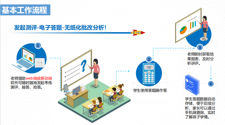 一、教培机构现状分析: 1、课堂教学节奏紧凑,缺乏互动性与趣味性。 2、学生对于当堂课知识点的掌握情况,老师无法及时知晓,培训效果无法保证。 3、对于学生完成的课后作业,老师需耗费大量时间批改。 4、招生竞争压力大,无差异化优势,很难吸引生源。 二、方案概述: 老师通过智答星AI教学系统可随时随地发起考练测评、抽答、抢答、课后作业,学生通过答题器作答,系统自动统计作答结果,并生成多维、丰富的分析报表,老师可及时了解学生对于当堂课知识点掌握情况,对于高频错题,可以及时讲评,提升教学效率。同时,学生答题数据云端存储,家长通过移动端可随时随地了解孩子课堂表现及知识点掌握情况,为家长提供及时有效的反馈信息,让家长看得到孩子进步(培训效果)。智答星AI教学系统通过差异化教学方式,有效提升教学效果,帮助培训机构树立良好口碑,为机构招生赋能。 三、方案组成: 每个学生配备1台答题器,用于课堂互动答题及课后作业作答提交。每间教室配备1台接收器,用于与答题器之间进行数据交互,接收器通过USB线连接电脑,无需外接电源,部署便捷。 四、系统功能介绍: 即兴问答:随堂提问,发起即兴问答,知识点掌握如何,及时知晓。 随堂检测:当堂测验学情,自动批改并生成分析报告,高频错题及时讲评。 课堂互动:系统提供了多种课堂互动方式,如抢答、抽答、投票等,满足了多种教学互动场景的需求。 课后作业:老师布置课后作业,学生回家使用答题器作答,返校自动提交,系统自动批改统计,减轻老师负担。 成长可视:家长通过移动端可随时随地了解孩子课堂表现及知识点掌握情况,为家长提供及时有效的反馈信息。 五、方案价值: 帮助教师把握课堂氛围与节奏。通过智答星AI教学系统即兴问答功能,老师可以及时掌握学生的课堂注意力与知识点掌握情况,对学生的学习状态有更加深入的了解。在此基础上,老师可以更加精准地把握课堂节奏和氛围,使讲解重点更加清晰,进一步提升教学质量。 增强课堂互动性及趣味性。智答星AI教学系统提供了多种课堂互动方式,如即兴问答、抢答、抽答、投票等,满足了多种教学互动场景的需求,能够调动学生的求知欲和好胜心,使学生更加积极参与课堂。通过答题器互动,学生可以在轻松愉快的氛围中学习知识,找到课堂参与成就感,提升学习效果。 提高教学效率。老师想了解学生对于当堂课知识点掌握情况,可通过智答星AI教学系统随堂检测功能快速发起测试,学生通过答题器完成作答并提交,系统自动批改并生成多维、丰富的报表。对于高频错题,可以及时讲评,有效提升教学效率。 为老师减负。老师通过智答星AI教学系统课后作业功能下发课后作业,学生回家使用答题器作答,返校自动提交上传,系统自动批改统计,减轻老师负担。 家校互通,成长可视。智答星AI教学系统为家长提供了学生学情跟踪系统。家长通过移动端可随时随地了解孩子课堂表现及知识点掌握情况,为家长提供及时有效的反馈信息,让家长看得到孩子进步(培训效果)。 为培训机构招生赋能。智答星AI教学系统通过差异化教学方式,有效提升教学效果,帮助培训机构树立良好口碑,为机构招生赋能。