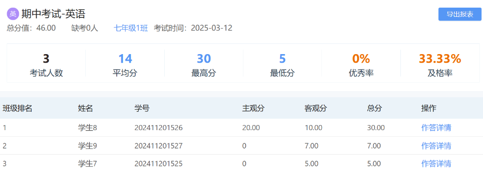 语音答题器作为一种交互式教学工具,在课堂场景中具有广泛的应用价值,主要围绕提升课堂互动性、实时反馈和个性化教学展开。以下是具体的应用场景分析: 一、课堂互动与参与度提升 快速答题与实时反馈 应用场景:教师提出问题后,学生通过语音答题器快速回答(如选择题、判断题、数字题)。系统自动统计答题结果,实时显示正确率、错误选项分布等数据。 优势: 节省时间,避免传统举手回答的效率低下; 降低学生心理压力,鼓励更多学生参与; 教师可即时调整教学节奏,针对高频错误选项进行讲解。 分组竞赛与协作学习 应用场景:将学生分组,通过答题器进行团队竞赛(如抢答、限时答题)。系统记录各组得分,生成排行榜。 优势: 激发竞争意识,提升课堂活跃度; 培养团队协作能力,促进同伴学习。 二、课堂管理与行为监督 考勤与课堂参与度统计 应用场景:学生通过答题器签到,系统自动记录出勤情况。同时,统计学生答题次数、正确率等数据,评估课堂参与度。 优势: 减少人工点名时间,提高课堂效率; 数据化记录便于教师跟踪学生学习状态。 注意力监控与行为干预 应用场景:结合答题数据,分析学生答题速度、正确率变化,推断注意力分散情况。 优势: 帮助教师及时调整教学策略,如增加互动环节或调整讲解节奏。 三、个性化教学与差异化指导 分层教学与精准辅导 应用场景:根据答题数据,将学生分为不同水平组,提供针对性练习或拓展内容。 优势: 实现“因材施教”,满足不同学生的需求; 减少“一刀切”教学,提高学习效果。 个性化学习路径规划 应用场景:通过长期答题数据,分析学生知识薄弱点,推荐个性化学习资源(如视频、练习题)。 优势: 帮助学生查漏补缺,提升自主学习能力。 四、考试测评与及时批改统计 以考代练与实时统计 应用场景:老师借助语音答题器配套软件可随时发起一次练习、考试,学生通过语音答题器提交答案,系统实时呈现考练批改统计结果。 优势: 答题器代替涂答题纸,节省成本; 实时批改,及时评讲,针对薄弱环节加强讲解和训练; 减轻教师批改负担,提高教学效率。 五、语言学习与口语训练 发音纠正与口语评估 应用场景:在语言课堂中,学生通过答题器朗读单词、句子,系统自动评分并给出反馈(如发音准确性、语调等)。 优势: 提供即时反馈,帮助学生改进发音。 情景对话与角色扮演 应用场景:借助答题器平台模拟对话场景,学生通过语音答题器与虚拟角色进行互动,系统评估语言表达和逻辑能力。 优势: 增强语言应用能力,提升学习趣味性。 六、数字素养与科技应用 自主学习与大胆探索 应用场景:课堂上,老师可以设定某个话题或知识点,学生通过语音答题器自由向AI提问,AI及时进行解答,拓宽知识面。 优势: 鼓励探索。AI可以推荐相关的学习资源,鼓励学生自主拓展知识,培养独立学习的习惯; 熟悉AI工具。与AI的互动让学生提前适应人工智能技术,为未来的学习和工作做好准备。