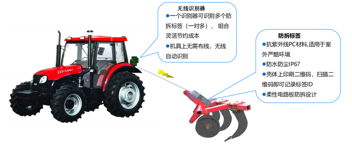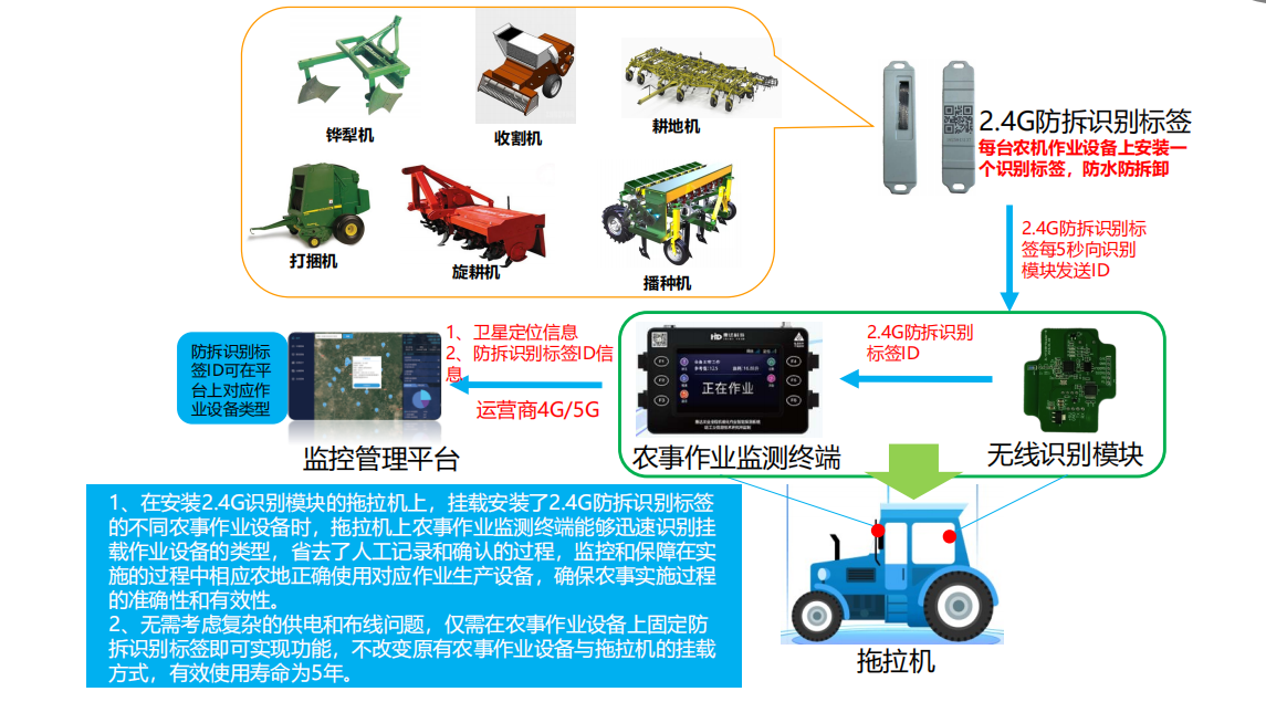 1、通过拖拉机上的2.4G识别模块对农机车上的2.4G防拆标签的定时读取,实时监控农机的使用情况。