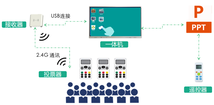 投票器方案是依托一体机为互动载体,整合投票器、接收器等设备,无需安装服务器,直接通过Microsoft Offic PPT 插件完成互动的智能解决方案,并把结果进行有效分析和统计。